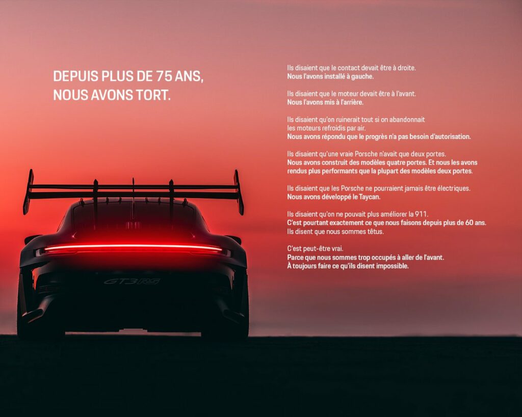 Avec cette campagne, Porsche démontre une nouvelle fois la force de son positionnement en transformant les critiques adressées à la marque en un véritable manifeste identitaire. Plutôt que de chercher à se justifier ou à s’adapter aux attentes de tous, Porsche assume pleinement ce qui fait son ADN, quitte à cliver. Cette prise de parole illustre une communication de marque mature, cohérente et audacieuse, qui privilégie la fidélité à ses valeurs plutôt que la séduction de masse. En tant qu’étudiant en communication, cette campagne apparaît comme un exemple pertinent de stratégie de marque assumée, où la culture et l’héritage deviennent le message central.