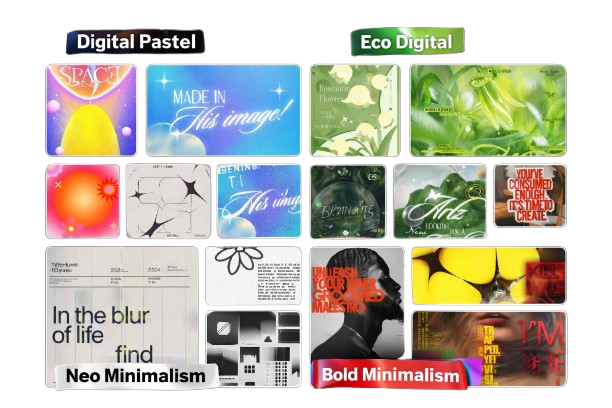 Neo Minimalism : un minimalisme repensé, plus conceptuel et expérimental, où la forme et la typographie deviennent centrales.