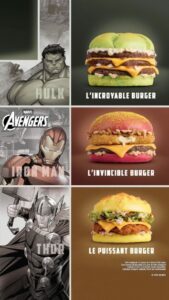 Cette campagne joue sur un co-branding clair et efficace entre Quick et l’univers Avengers. Chaque burger est directement associé à un héros, avec une traduction visuelle et produit : couleurs, textures et noms reprennent les caractéristiques des personnages (force, puissance, invincibilité).